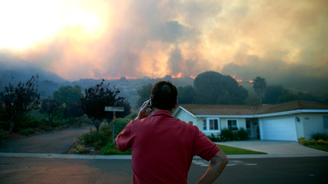 Reuben Ruiz makes a phone call as he watches the flames from a brush fire in Camarillo, Calif., Thursday, May 2, 2013. (AP Photo/The Ventura County Star, Troy Harvey) LOS ANGELES TIMES OUT, LOS ANGELES DAILY NEWS OUTThe Associated Press