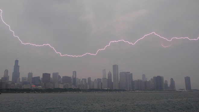 June 12, 2013: Lighting flashes over the Chicago skyline. An unusually massive line of storms packing hail, lightning and tree-toppling winds was rolling through the Midwest on Wednesday and could affect more than one in five Americans from Iowa to Maryland.AP