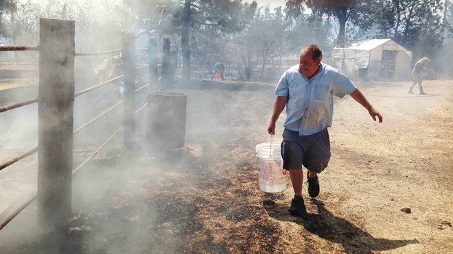 • A resident carries a bucket of water to help fight the brush fire burning right up to his property in the hills above Banning, Calif., on Wednesday, May 1, 2013. (AP Photo/The Press-Enterprise, Terry Pierson)The Associated Press